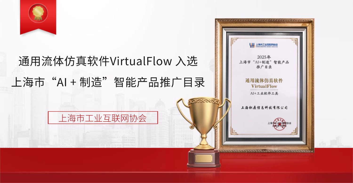 上海市“AI+制造”智能产品推广目录,是上海市工业互联网协会为深入贯彻国家人工智能赋能新型工业化战略部署而开展的重要评选工作。协会始终聚焦制造业数字化转型与高质量发展,此次目录重点征集具备自主知识产权、高技术水平及广阔工业推广前景的智能产品。积鼎科技 VirtualFlow 软件凭借在 AI 技术与工业仿真深度融合领域的突破性成果及丰富实践应用经验成功入选。